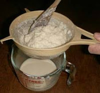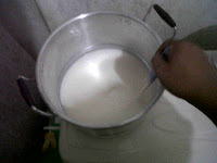 - Menyaring untuk memisahkan gumpalan dengan air/whey menggunakan saringan yang agak kasar.